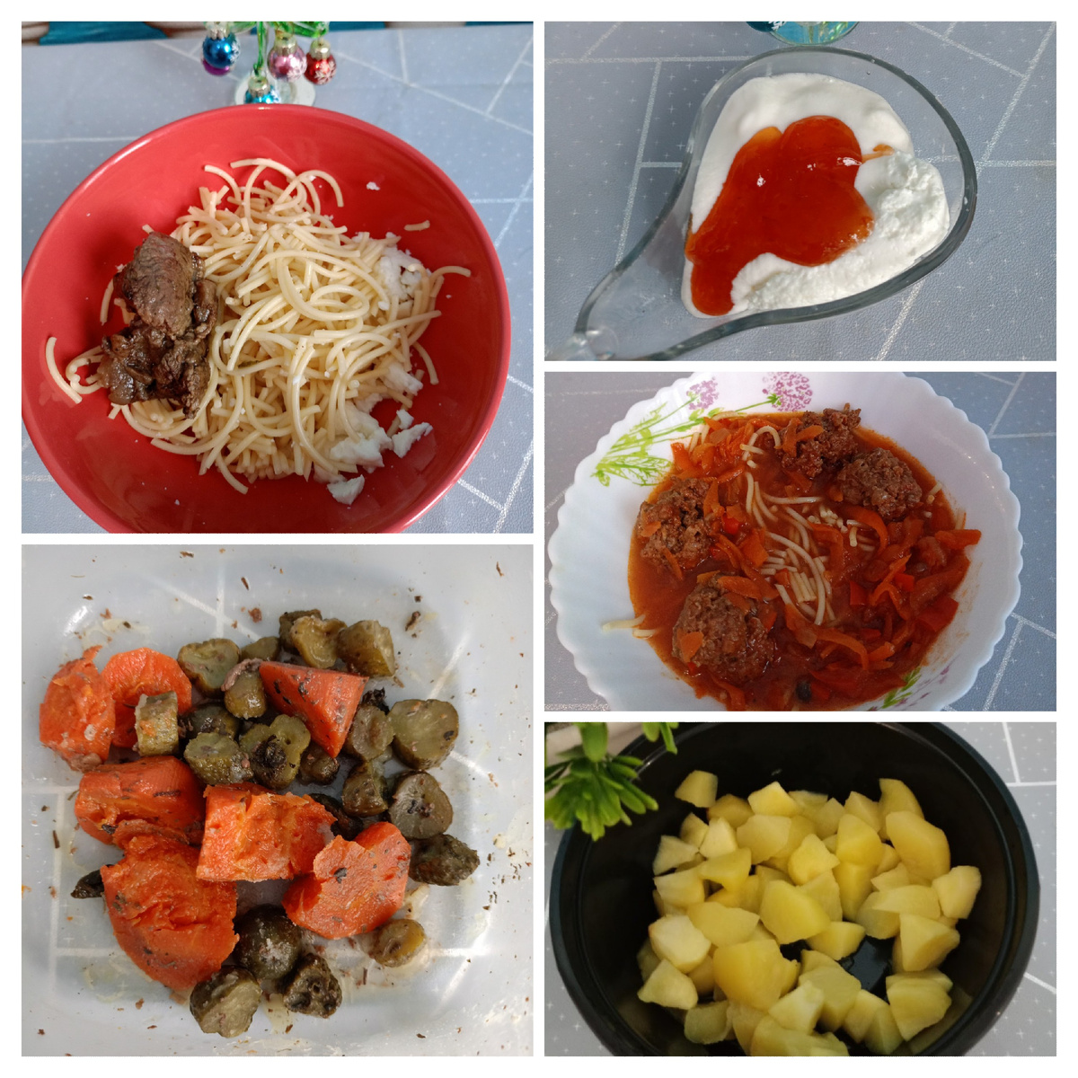 •Обед - макароны отварные; фрикадельки говяжьи в томатном соусе.