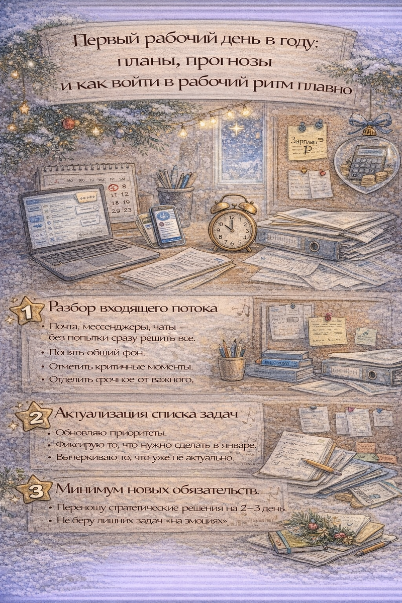 Первый рабочий день после длинных праздников — всегда особенный. Формально это уже «рабочие будни», но по ощущениям — еще не совсем. Голова помнит запах мандаринов, тело сопротивляется ранним подъемам, а календарь уже настойчиво напоминает о дедлайнах, отчетности и задачах, которые не терпят отлагательств. За годы работы я поняла одну важную вещь: резкий старт после праздников почти всегда приводит к перегрузке, а не к эффективности. Поэтому первый рабочий день — это не про «включиться на 100%», а про грамотную настройку ритма. Если честно, у большинства сценарий похожий: И это нормально. Праздники — это не только отдых, но и смена ритма, а иногда и полная его потеря. Организму и психике нужно время, чтобы перестроиться. Первый день я осознанно делаю максимально щадящим, но при этом полезным. 1. Разбор входящего потока