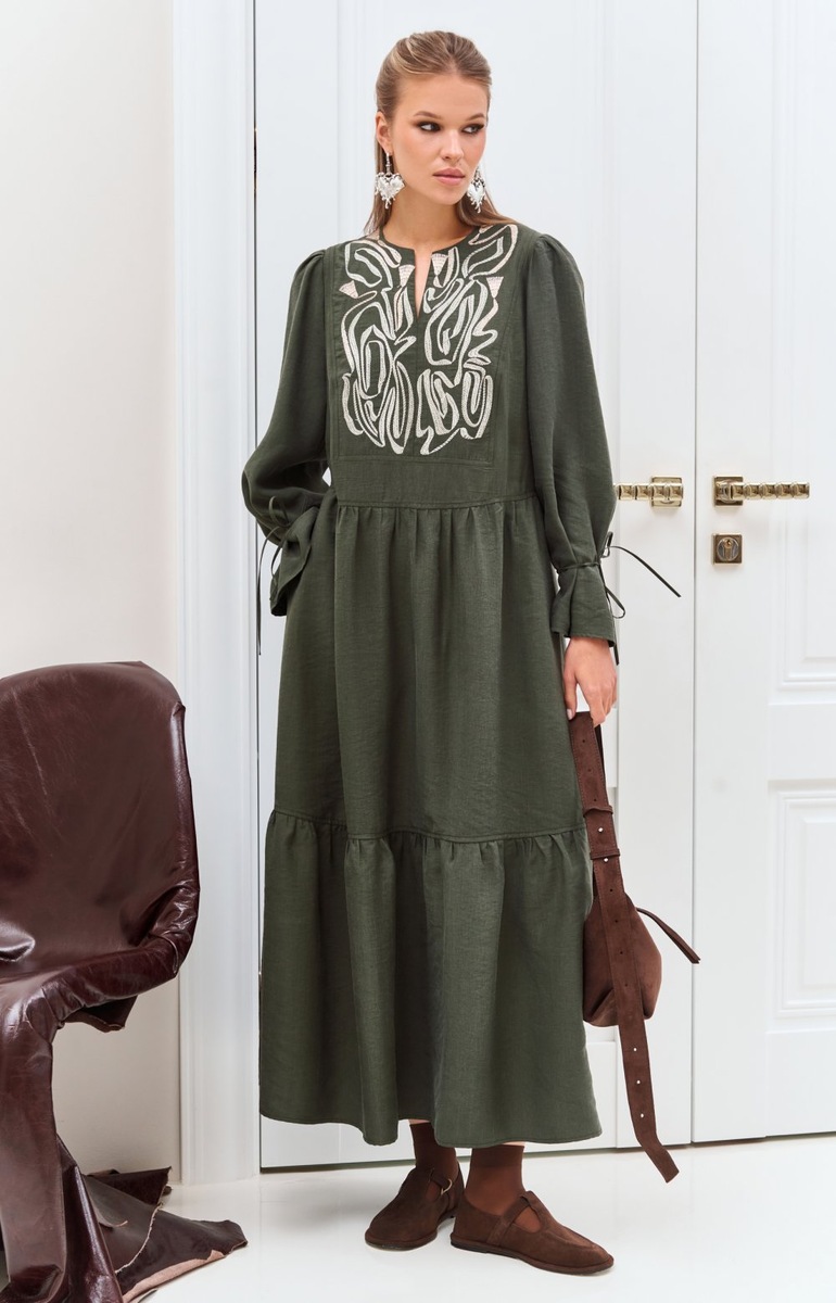 Платье Sati — это отказ от очевидного «нарядного». Его цвет — сложный хаки, вне сезонных трендов. Его линия — спокойная, но не нейтральная. Это платье не требует одобрения. Оно существует автономно. В сочетании с выразительными аксессуарами — крупным кольцом, жестким браслетом, архитектурной обувью — оно становится фоном для личности, а не конкурирует с ней.