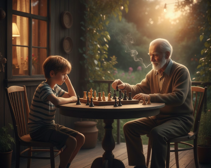 Мой внук всё лето играл в шахматы с «дедушкой» на дачной веранде. Но его дедушка, мой отец, умер за 30 лет до его рождения. Мы купили старую дачу. Внук Саша, городской ребёнок, скучал первые дни, пока не нашёл на чердаке шахматную доску с тяжелыми, старыми фигурами. Он увлёкся и пытался научить играть меня, но я не силён. Как-то раз я увидел его сидящим на веранде перед доской. Он делал ход, потом вставал, пересаживался на другой стул, хмурился, делал ответный ход. «С кем играешь?» — спросил я. «С дедушкой, — ответил он не отрываясь. — Он научил меня итальянской партии». У меня похолодело внутри. Моего отца, его прадеда, не было в живых уже тридцать лет. Он действительно был страстным шахматистом и любил итальянскую партию. Но откуда мог знать Саша? «Какой дедушка?» — стараясь говорить спокойно, уточнил я. «Ну, который здесь жил. Он показал мне, где ягоды малины самые сладкие, и сказал, чтобы я не лазил на старый сарай. А ещё он сказал, что его зовут Николай, как тебя, деда». Я никогда