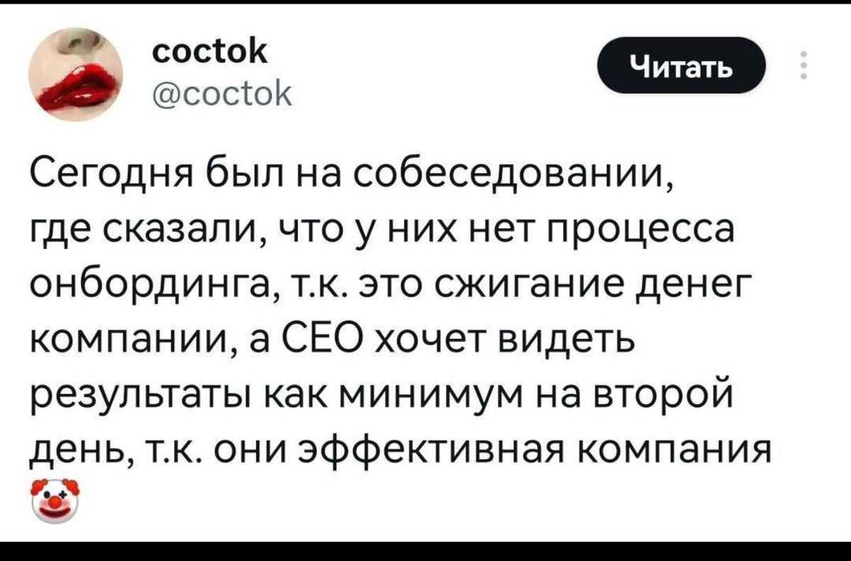 У вас есть онбоардинг? У нас нет. Это минус. Плюс - выживает сильнейший :) Просто в малом бизнесе особо нет ресурсов, которые можно выделить на онбоардинг нового человека.