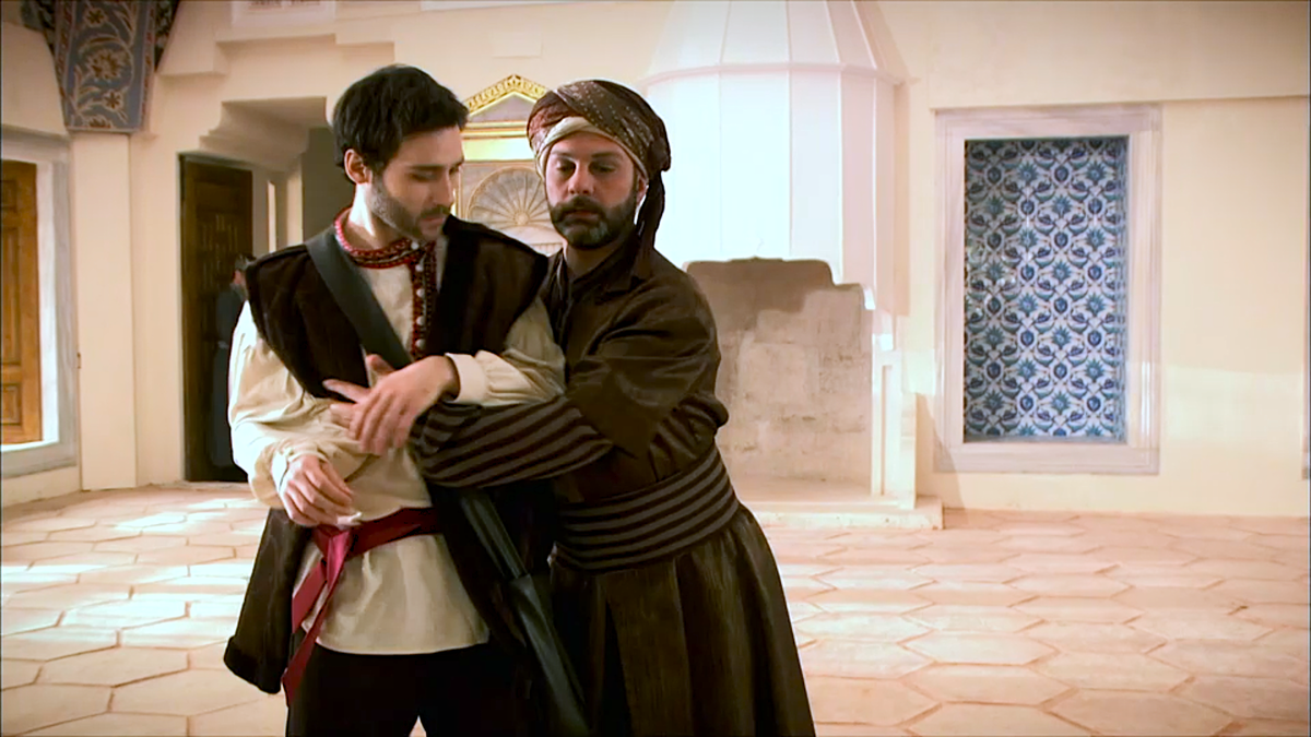 - Не поворачивайся, не смотри, а то лишишься головы! - предупреждает Матракчи, крепко удерживая художника Луку. А тот, как услышал крик "дорогу", так сразу залюбопытствовал. Лука уже не первый день в чужом государстве, но порядков здешних до сих пор не знает. Матракчи объяснять некогда. Вот-вот зайдут дамы падишаха. Смотреть на них нельзя. Главное, чтобы художник из Крыма головой не вертел. - Ни звука. Руки вот так, голову вниз, - лишь командует Матракчи. Лука слышит чьи-то лёгкие шаги. Зашли явно несколько человек. И так хочется взглянуть. Ну, почему же нельзя? О чём ему не сказал Матракчи? Вдруг он слышит женский вздох. Почему так часто стучит сердце? И тут какая-то женщина спрашивает: - Тебе, Хюррем, нравится? - Нравится. Очень красивый дворец, - отвечает другая. Но почему этот голос так знаком? В нём так много родного. А вдруг это она, Александра? - Здесь должна царить радость, Хатидже Султан. Ведь тут на свет появятся Ваши дети. На этой стене прикажите нарисовать много цветов. Г