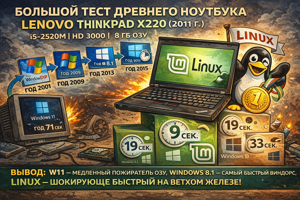 Привет! Ребята, пристегните ремни! Сегодня мы будем заниматься настоящим техно-вуду. У нас на операционном столе легенда, икона и просто кирпич, которым можно отбиться от грабителей - Lenovo ThinkPad X220 родом из 2011 года. Внутри у него «пламенный привет» из прошлого: i5-2520M, древняя графика HD 3000, 8 ГБ оперативки и обычный, скрипучий как дедова коленка, HDD на 256 ГБ. По меркам 2026 года - это калькулятор. Но парень под ником TrigrZolt решил устроить этому пенсионеру «Голодные игры» и по очереди накатил на него всё: от ламповой XP до современной Windows 11 24H2. Результаты? Это не просто тесты, это чистый, неразбавленный троллинг Microsoft. Представьте: вы нажали кнопку Power и пошли заваривать чай. Тут начинается настоящий цирк. Через 5 минут после загрузки, когда ноутбук просто «дышит»: Экспериментатор копнул глубже, и вот вам список причин, почему Win11 на старом железе работает как улитка под транквилизаторами: Вердикт TrigrZolt прост: Если ваш ноут старше 2019 года, Window