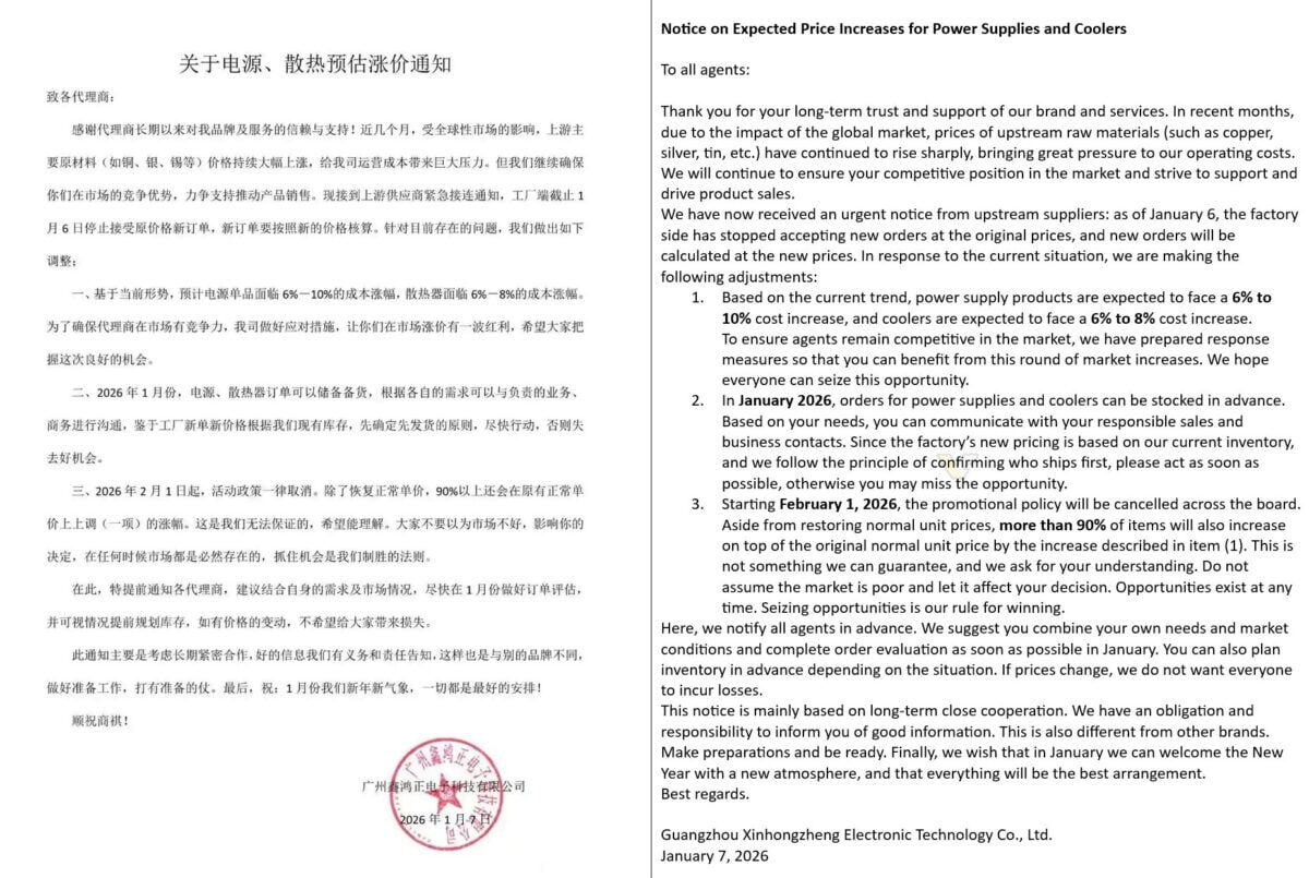Компания Guangzhou Electronic Technology Co. Ltd. уведомила магазины о предстоящем повышении цен на блоки питания и кулеры на 10% из-за дефицита меди, серебра и олова. Цены начнут расти с 1 февраля 2026 года. Ожидается дальнейшее влияние дефицита на стоимость комплектующих. https://dzen.ru/id/5c0e38ff46ef5c00aaa80527