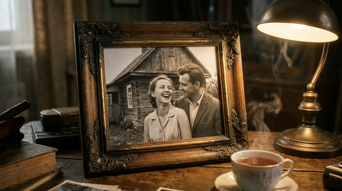 Я повертела рамку в руках. Под стеклом – чёрно-белый снимок. Двое. Мужчина и женщина, молодые, на фоне деревянного дома. Она смеётся, он смотрит на неё. Шестидесятые, судя по одежде и причёскам. Она в лёгком платье с широкой юбкой, волосы убраны назад. Он в светлом пиджаке, тёмные волосы аккуратно зачёсаны.
