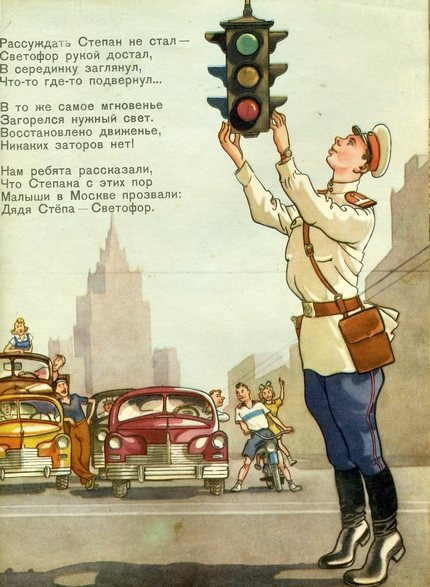 Наверное, все со мной согласятся, что самые лучшие иллюстрации к стихотворениям Сергея Михалкова «Дядя Степа» и «Дядя Степа – милиционер» нарисовал художник-иллюстратор Константин Ротов. Так вот если посмотреть на всем известные иллюстрации, то можно заметить … например, то, что милиционер дядя Степа чинит какой-то неправильный светофор. У него красный цвет находится снизу!!! Что это такое?! Ротов, что, не знал, где у светофора красный?! Или это в типографии цвета перепутали?! Не переживайте, никто ничего не перепутал! Я вам больше скажу! Можно в этих ваших интернетах найти старый советский фильм «Улица полна неожиданностей», вышедший в 1957 году. И там вы неожиданно для себя увидите, что зеленый сигнал светофора загорается наверху, а красный – внизу. Вот уж на самом деле «Улица полна неожиданностей»!!! Как же такое могло получиться?! На самом деле очень просто. В 1957 году, когда были созданы иллюстрации Ротова для «Дяди Степы» и снят фильм «Улица полна неожиданностей», в СССР действо