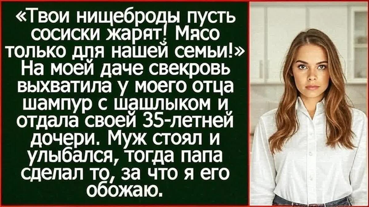 Праздник умер, даже не начавшись. Люди за столом — какие-то дальние родственники свекрови — начали тихо переговариваться, пряча глаза в тарелки. Никто не засмеялся, но никто и не возразил. Воздух пропитался не запахом шашлыка, а липким, удушливым стыдом.