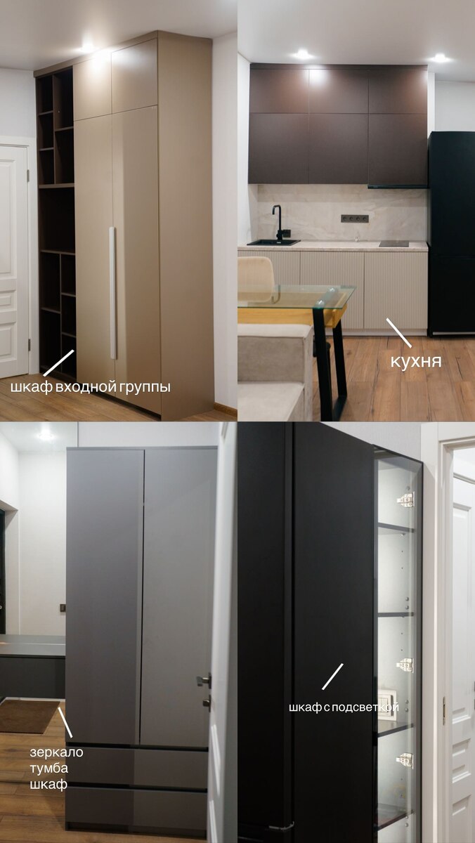 ◾Главным решением для хранения стал высокий шкаф до потолка без зазоров, который зрительно увеличивает пространство ◾В кухне-гостиной установили гарнитур в трендовой цветовой комбинации коричневый-бежевый, дополнив его стильным шкафом с прозрачным стеклом и подсветкой Tatu Wood— КУХНИ, ГАРДЕРОБНЫЕ, СПАЛЬНИ И МНОГОЕ ДРУГОЕ!