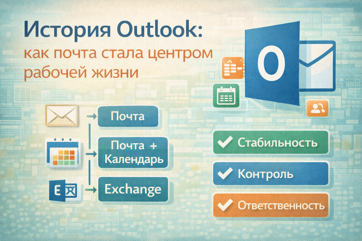 История Outlook: как почта стала центром рабочей жизни. Почему он стал корпоративным стандартом, чем отличался от других почтовых клиентов и почему жив до сих пор. Outlook редко любят. Его терпят. Используют. Оставляют «как есть». И при этом именно Outlook стал тем местом, где проходит половина рабочего дня миллионов людей. Раньше почта была просто почтой. Письма приходили, на них отвечали — и всё. Задачи жили в блокнотах. Встречи — в голове или на бумаге. Контакты — где придётся. Работа была разорвана на части. Microsoft не хотела сделать «удобную почту». Она хотела создать рабочую систему. Outlook задумывался как центр, где сходятся: