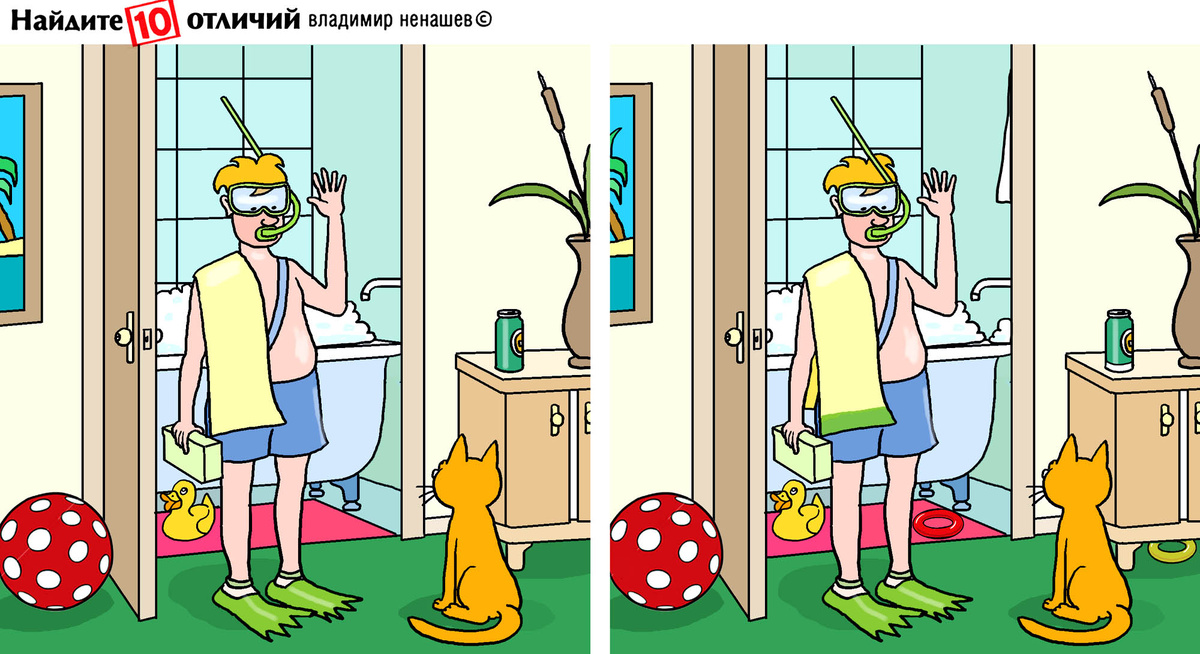 10 отличий для внимания. Позитивный тест про кота, ванну и ласты. Сюжет юмористический.