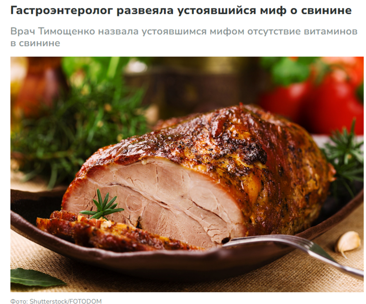 Гастроэнтеролог Анастасия Тимощенко напоминает: свинина — один из самых недооценённых источников нутриентов, особенно витаминов группы B, которые критичны для иммунитета, нервной системы и энергетического метаболизма. Нутриент Сравнение с другими мясами Функция в организме Витамин B1 (тиамин) в 5 раз больше, чем в говядине и курице Поддержка митохондриального метаболизма, выработка ацетилхолина (нейромедиатор памяти) Витамин B6 (пиридоксин) выше, чем в индейке Синтез серотонина, дофамина, ГАМК — регуляция настроения и сна Витамин B12 сопоставим с говядиной Производство эритроцитов, миелиновой оболочки нервов Селен один из самых высоких среди мяса Активация тиреоидных гормонов (T4 → T3), антиоксидантная защита (глутатионпероксидаза) Цинк биодоступная форма (гемовый) Иммунная регуляция, синтеж тестостерона, заживление тканей Железо (гемовое) усваивается на 25–35% (vs 2–10% из растений) Профилактика анемии, поддержка когнитивной функции 🔹 Жир свинины — не «враг»: