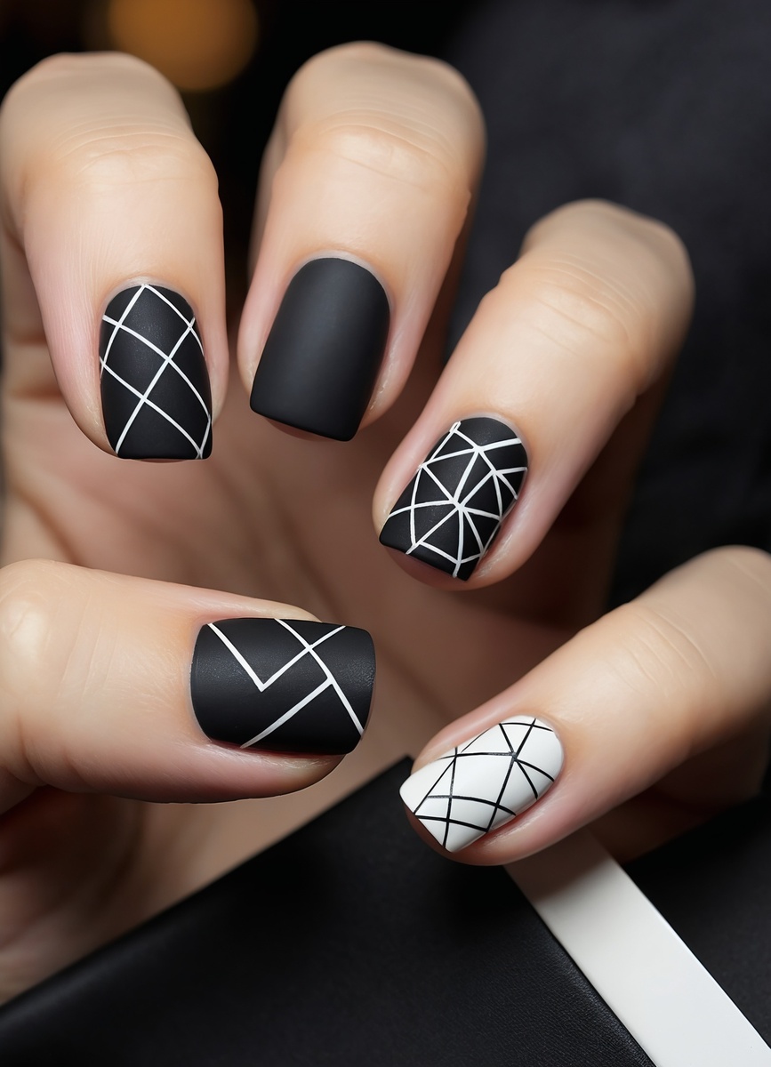 Геометрические узоры идеально подходят для коротких ногтей, особенно в темных тонах. Прямые линии, треугольники и квадратные формы визуально удлиняют ногти и создают современный вид. Использование черного, темно-синего или бордового фона в сочетании с контрастными белыми или металлическими элементами добавляет изысканности. Минимализм, проявляющийся в простоте и лаконичности дизайна, делает маникюр универсальным, подходящим как для повседневной жизни, так и для особых случаев.