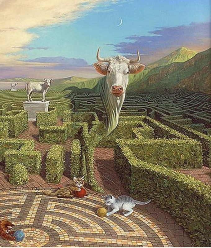 Облака бороздили небесный купол, словно вылитый из потемневшего аквамарина, крыша отливала серебром, а из окна на последнем этаже высовывалась огромная рогатая голова. Голова наконец высунулась полностью, и стало понятно, что это толстая неповоротливая корова. Она неуклюже взгромоздилась на подоконник и, легонько оттолкнувшись, неспешно побрела по воздуху к соседнему зданию. Корова практически вся была покрыта снежно-белым пухом, и только чёрная клякса на боку нарушала эту плюшевую гармонию. Писатель замер в изумлении.