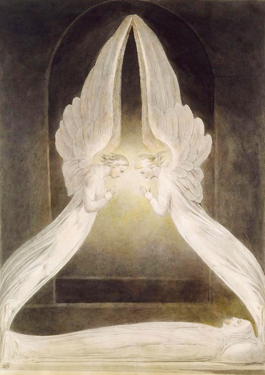 "Ангелы, парящие над гробом Христовым " — это знаменитая картина английского художника и поэта Уильяма Блейка , написанная в 1805 году . Она является частью его более широкого творчества, которое отражает мистические и религиозные темы, а также глубокие переживания жизни и смерти.