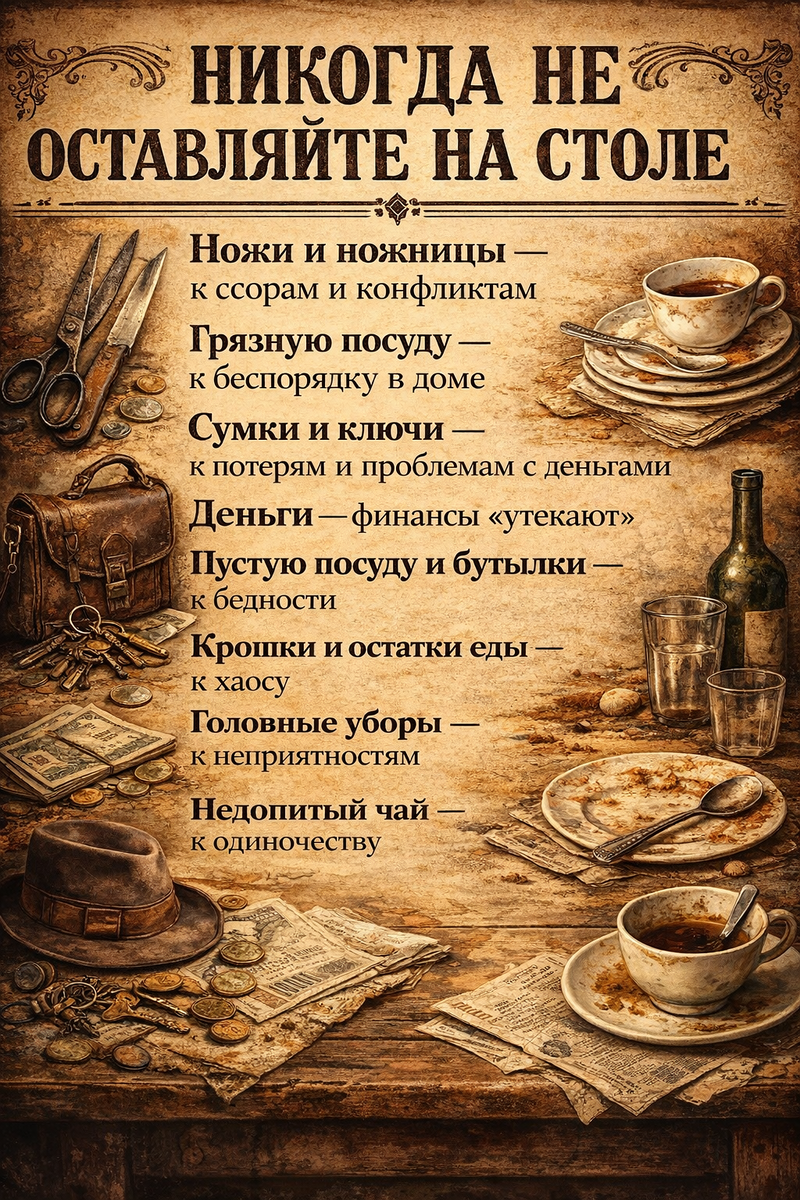 Когда на столе остаются определённые предметы, это может повлечь за собой неприятные последствия. Эта старая пословица напоминает нам о важности порядка в доме и жизни. Не оставляйте ножи, грязную посуду, пустые бутылки или не допитый чай — все эти вещи могут привести к проблемам в отношениях, финансовым трудностям или одиночеству. Берегите свою атмосферу и уют в доме, ведь каждый элемент имеет