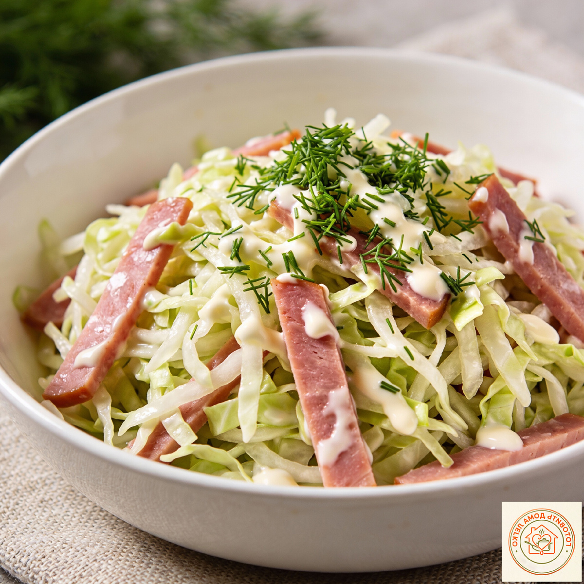 2. Колбасу/ветчину нарезаем соломкой и выкладываем к капусте.