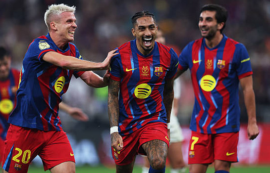 Очередное Эль-Класико в рамках финала Суперкубка Испании удалось на славу! "Барселона" и мадридский "Реал" выдали поистине выдающийся финал с большим количеством забитых мячей, многочисленными яркими эпизодами и невероятным напряжением до самых последних секунд. Нельзя сказать, что команды долго раскочегаривались. Они достаточно быстро взяли хороший темп и создавали острые моменты у ворот друг друга. Но в концовке первого тайма игра по-настоящему разогрелась. "Барселона" ожидаемо больше владела мячом в позиционных атаках, а "Реал" делал ставку на резвые контрвыпады. Именно каталонцы открыли счёт усилиями Рафиньи. А дальше на поле началось самое настоящее безумие. В компенсированное время к первой сорокапятиминутке команды умудрились забить три мяча. Сначала Винисиус прервал затянувшуюся безголевую серию и сравнял счёт после классного индивидуального прохода. Тут же сине-гранатовые усилиями Левандовского вернули себе лидерство. Однако королевский клуб успел восстановить равновесие до перерыва благодаря результативному удару Гонсало Гарсии после углового. В стартовом отрезке второго тайма предпочтительнее выглядели мадридцы. Поймавший кураж Винисиус чуть ли не в одиночку раз за разом создавал острые моменты, однако в их реализации форвард "Реала" не преуспел. Зато "Барселона" в середине второй сорокапятиминутки выдала яркий отрезок, увенчавшийся успехом. Рафинья оформил дубль и вернул лидерство команде Флика. В оставшееся время "сливочные", разумеется, бросили все силы на исправление ситуации. Алонсо всё-таки выпустил Мбаппе со скамейки на концовку матча. Килиан активно вошёл в игру и под занавес основного времени заработал для мадридцев численное преимущество, вынудив де Йонга схлопотать прямую красную карточку. Королевский клуб имел отличные шансы реализовать большинство и избежать поражения, но Хоан Гарсия парировал опасные удары Каррераса и Асенсио. "Барселона" выстояла вдесятером и выиграла Суперкубок Испании второй год подряд. Для каталонцев это шестнадцатый успех в данном соревновании. "Барселона" стала первым действующим победителем Ла Лиги, завоевавшим Суперкубок с момента введения формата из четырёх участников в 2020-м году.
