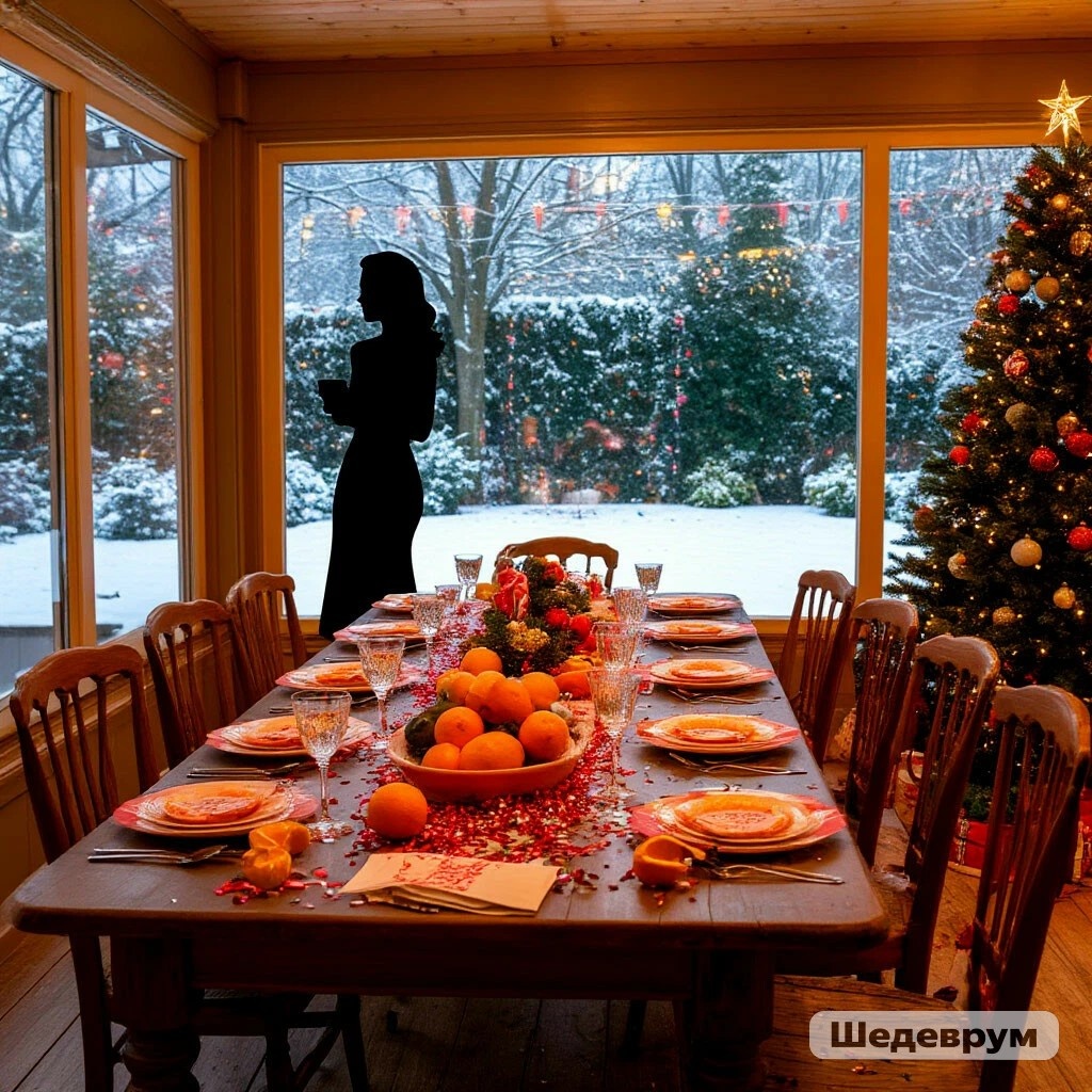 Следующим утром Полина проснулась от звенящей тишины. Дом казался необычно пустым и гулким. Она налила себе кофе и вышла на террасу, любуясь заснеженным садом. В воздухе всё ещё пахло снегом и мандаринами, во дворе пестрили лужайки конфетти.