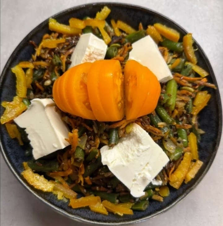 Некоторые продукты заранее записывают в «скучные», «диетические», «на любителя». Как пример, стручковая фасоль, которая многим кажется пресной, «невкусной» или слишком диетической — но это только до того момента, пока не приготовить её с подходящими ингредиентами. Как и со многими вещами в жизни, всё решает контекст и внимание к деталям. И, в данном случае, ещё способ приготовления. Начинаем с классического сочетания на сковороде — обжариваем лук и морковь до лёгкой золотистости. Такая поджарка даёт глубину и насыщенность вкуса и цвета. И только затем добавляем фасоль, она слегка впитывает ароматы, остаётся хрустящей и аппетитной. Подача, как всегда, играет неотъемлемую роль — сыр, жёлтый помидор и смесь семян усиливают разнообразие. Соевый соус тоже будет уместен. И вот наша фасоль — низкокалорийный продукт, богатый белком, железом и клетчаткой — готова в самом вкусном прочтении! Фасоль в таком виде — это не компромисс между вкусно и полезно, а полноценное блюдо, которое удовлетворяет