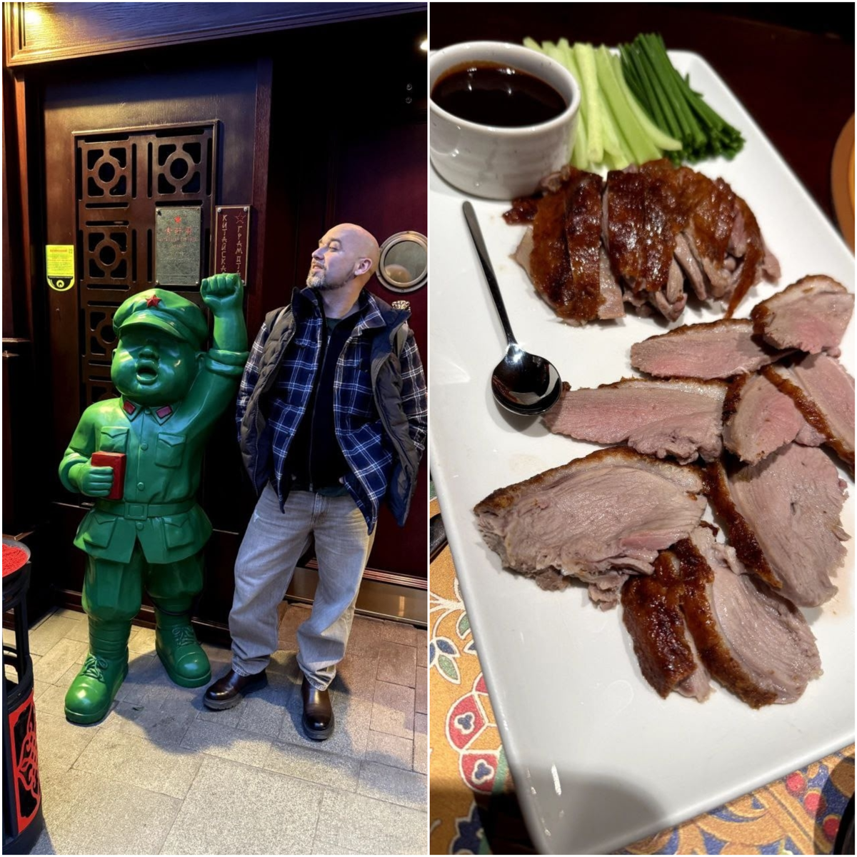 Это первый и, пожалуй, один из наиболее интересных проектов Раппопорта, так хорошо знакомых московской публике. Интерьер погружает в атмосферу континентального Китая, со множеством статуэток, ваз, около революционных портретов и множеством аутентичных элементов. Впервые пробовал утку по-пекински. Периодически видел, много слышал про это блюдо.
