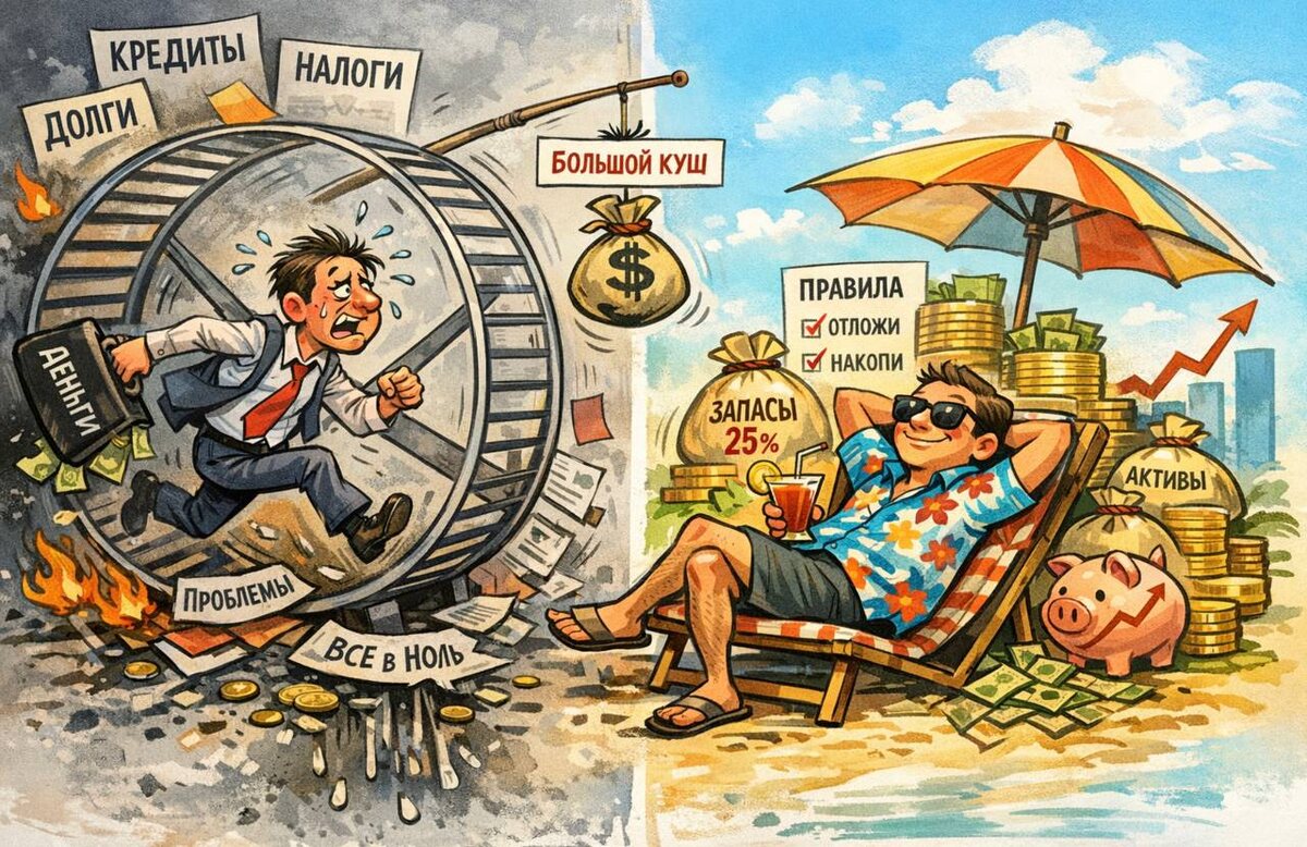 Небольшая фирма. Обороты есть, заказы прут, работаешь без остановки. У основателя — ноль запаса, ноль устойчивости, ноль свободы. Рынок сложный. Налоги растут. Клиенты платят плохо. Время тяжёлое — «понимать надо». «Бедность — не следствие судьбы, а следствие отсутствия правил» © Какой финансовый фундамент под этим всем? Деньги тратятся до копейки. Надежда на «куш», который однажды закроет долги и напряжение. Расходы и доходы живут в режиме постоянной погони. Дальше включается простая математика. Если деньги делятся после трат — откладывать нечего. Система финансовой устойчивости выглядит прозаично: Деньги делятся в момент поступления, а не по остаточному принципу. Часть дохода объявляется неприкосновенной — всегда, а не в «хорошие месяцы». Уровень жизни не обязан расти вслед за доходом. Запас — это отдельный контур, не участвующий в тушении пожаров. Богатство — это не сумма на счёте. Это способность не зависеть от следующего поступления денег.
