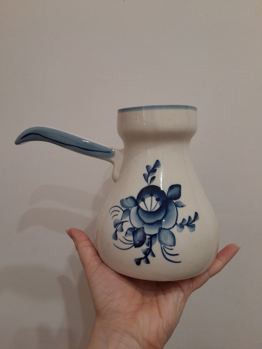 Турка, гжель, можно использовать пл прямому назначению. Большая, около литра. Ушла за 600.