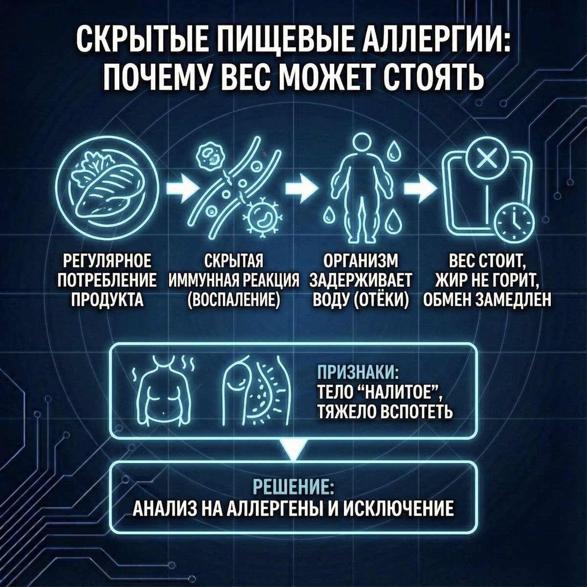 ” Есть одна штука, о которой почти никто не говорит — скрытые пищевые аллергии. Это не когда тебя сыпет, чешется или перехватывает дыхание. Это когда ты каждый день ешь один и тот же продукт — и организм молча с ним воюет. Пример. Ты регулярно ешь куриную грудку. Всё ок: не болит, не тошнит, не вздувает. Но при этом аллерген постоянно циркулирует в крови. Что делает организм? Он старается снизить концентрацию аллергена самым простым способом — 👉 разбавить его водой. В итоге: • ты начинаешь отекать, • тело выглядит не “жирным”, а как будто налитым жидкостью, • жировой компонент не висит, а выпирает, как пузырь. Есть ещё один характерный признак: таким людям очень тяжело вспотеть, даже на кардио. Пот идёт плохо, обмен “вязкий”, тело словно держит воду до последнего. И тут важный момент. Даже при дефиците калорий вес может не снижаться — потому что жидкость плохо мобильна, а это замедляет транспорт жиров в энергосистеме организма в целом. Решение на самом деле простое и не магическое: •