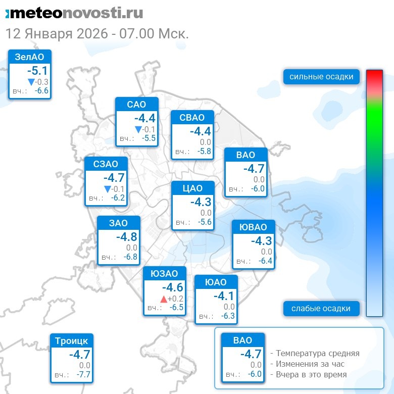 В 7:00 в Москве было от -5.4°C до -3.4°C, средняя температура -4.5°C #погода #Москва #зима #температура #12января #понедельник