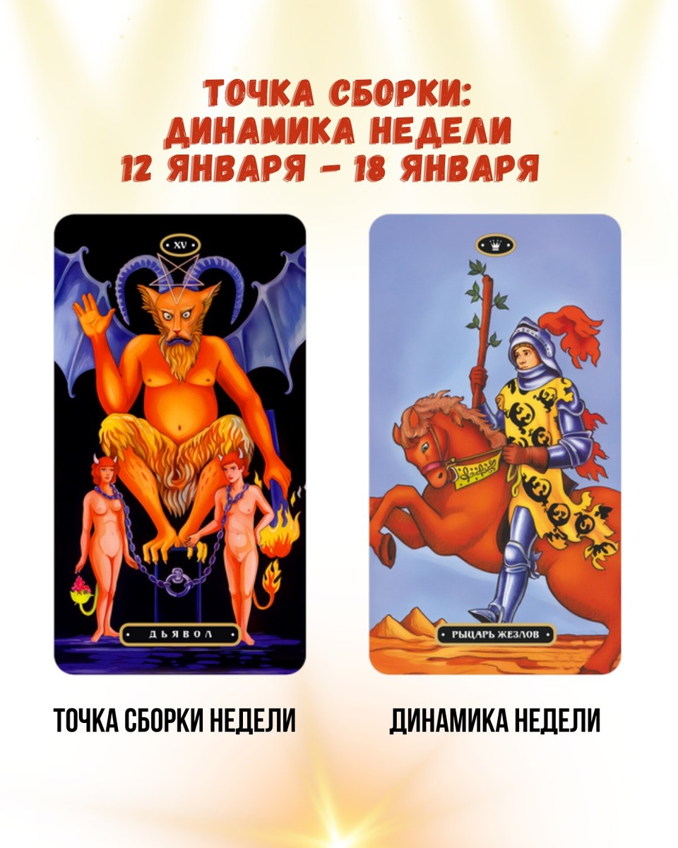 🔘🔘🔘🔘🔘 🔘🔘🔘🔘🔘🔘: ДИНАМИКА НЕДЕЛИ 1⃣ ТОЧКА СБОРКИ НЕДЕЛИ — Дьявол На этой неделе точка сборки — честность с собой без прикрас. Дьявол выводит в фокус всё, что: 💜держит на крючке, 💜манит, 💜затягивает, 💜даёт удовольствие, но забирает свободу. Это про зависимости, не обязательно жёсткие. Чаще тонкие: привязанности, привычные сценарии, эмоциональные качели, желание «ещё» вместо «достаточно». Дьявол не наказывает. Он показывает, где ты отдал(а) власть. Энергетическое состояние недели: напряжённая, горячая, притягательная энергия выбора. 2⃣ ДИНАМИКА НЕДЕЛИ — Рыцарь Жезлов Внешнее поле будет бурным. Рыцарь Жезлов — это: ✅ резкие движения ✅ импульсивные решения ✅ вспышки страсти ✅ неожиданные предложения ✅ желание действовать прямо сейчас. Неделя может подталкивать к поступкам «на адреналине». Темп высокий, события разворачиваются быстро, иногда без возможности всё обдумать. 3⃣ КЛЮЧЕВОЙ СМЫСЛ СОЧЕТАНИЯ Дьявол + Рыцарь Жезлов = «Искушение действием». Внутри — крючок. Снаружи