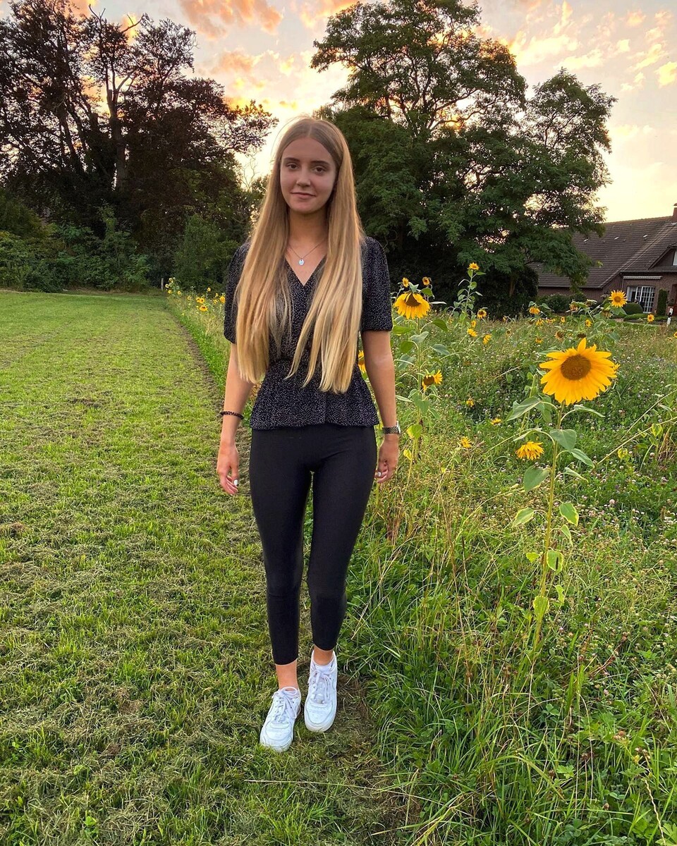 Она была одета просто, но со вкусом: тёмная блузка с едва заметным узором подчёркивала её стройную фигуру, а чёрные леггинсы придавали образу лёгкую непринуждённость. Белые кроссовки словно сливались с бликами закатного света, делая её походку почти невесомой. На шее — изящное украшение, едва заметное, но добавляющее образу утончённости.