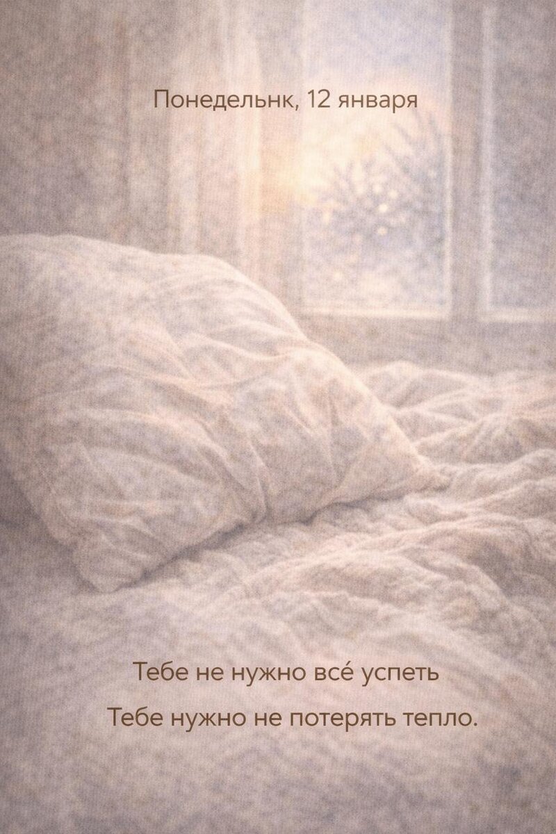 Но это не зима — это вата. А вата в теле не терпит холода, спешки и хаоса. ⚡Что происходит в теле и психике: Вторая неделя января — как утро понедельника: в голове — 100 мыслей, в животе — 0 огня. Много ветра, мало опоры. И тело в ответ может: – плохо спать, – терять аппетит, – быть "на грани", даже без причины. 📌Действие на неделю: 1. Стартуй день с одной тёплой кружки (вода/какао/имбирный чай). 2. Верни тёплую еду 2 раза в день. Хватит перекусов «на ходу». 3. Заводи ритуал заземления вечером: укутаться, прикоснуться к себе, выключить новости. Мини-тест: Кому нельзя сильно ускоряться сейчас? – Если утром холодно в конечностях. – Если после еды тяжесть и зевота. – Если на фоне усталости ты начинаешь «организовывать всех». 👉 Тебе не нужно всё успеть. Тебе нужно не потерять тепло. ✅Чек-лист недели: 1 кружка тёплого с утра 2 приёма еды в тишине 3 минуты паузы перед сном 0 холодного и сырое — в первой половине дня 1 раз — тёплое прикосновение к себе 💛Фраза недели: Сохрани, чтобы