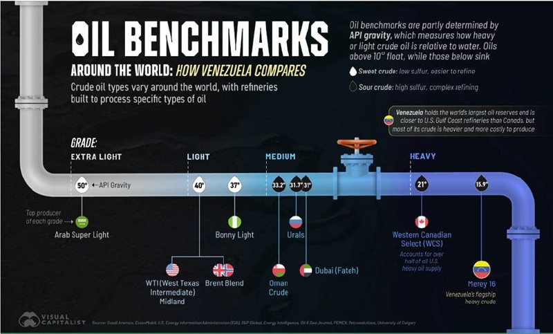 Сырая нефть - неоднородный продукт. Ее качество сильно варьируется в зависимости от региона, влияя на все, от проектирования НПЗ до глобальной логистики Основные, из наиболее торгуемых в мире сортов нефти, таких как Brent, WTI и Arab Light, легкие и малосернистые. Благодаря плотности API около 40° или выше и низкому содержанию серы, эти сорта нефти дешевле в переработке и позволяют получать более высокую долю высококачественного топлива Они служат ориентиром для глобального ценообразования. Флагманская смесь нефти Венесуэлы - Merey 16, имеет плотность API значительно ниже 20°. Кроме того оно содержит большое количество серы. Для нормальной переработки на НПЗ ее требуется смешивать с более легкими фракциями уже переработанной нефти, что значительно отягощает процесс и удорожает стоимость готового продукта @geonrgru | YouTube | sponsr.ru