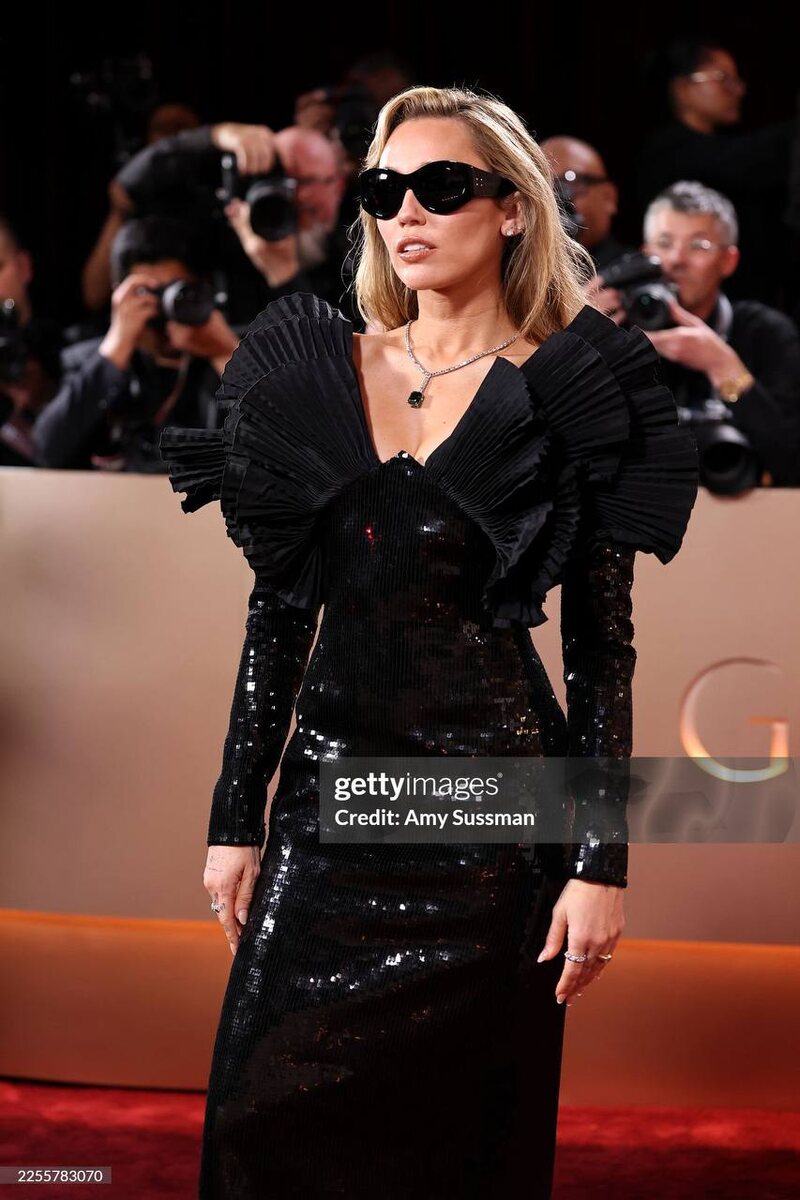Майли Сайрус продолжает выбирать гранжевые образы. На этот раз на певице черное макси с пайетками и трендовым готическим воротником.