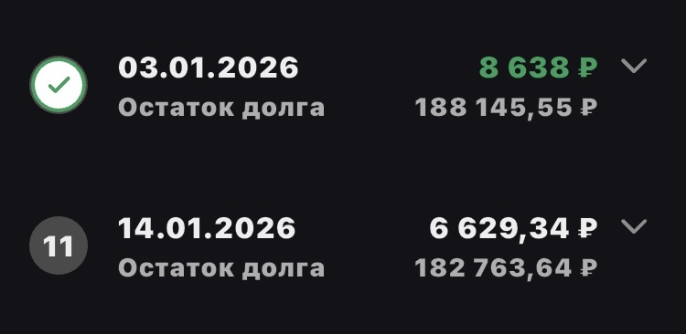 03.01.2026 внесено на досрочное гашение 8 638 рублей , а также ежемесячный платеж 6 629,34