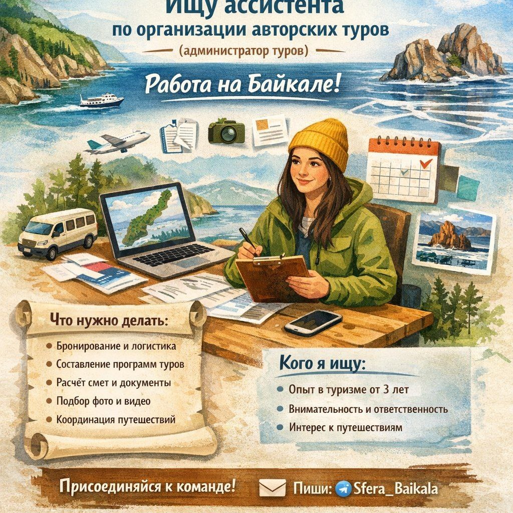 Управляя парк-отелем, набережной, туроператором, организацией масштабных мероприятий, я сам лично по прежнему разрабатываю маршруты и персонально сопровождаю некоторые группы. В этом году готовлю к открытию направление авторских туров Приглашаю к сотрудничеству Администора организации туров, кто возьмет на себя организацию авторских туров и станет важной частью проекта. Открою небольшой секрет. Зачастую, за авторскими турами, следует проекты развития туризма по этому маршруту. Быть первопроходцами очень интересно! Что нужно делать: Для опытного организатора это лёгкая и понятная работа: - бронирование проживания, транспорта, услуг (как внутренних у десятков резидентов Байкал-Аляски, так и внешних) - составление и оформление программ туров расчёт смет и контроль рентабельности - подготовка договоров и документов - подбор фото и видео для оформления туров - координация всех процессов до, во время и после путешествий Кого я ищу: - опыт в организации туров от 3 лет - понимание логистик