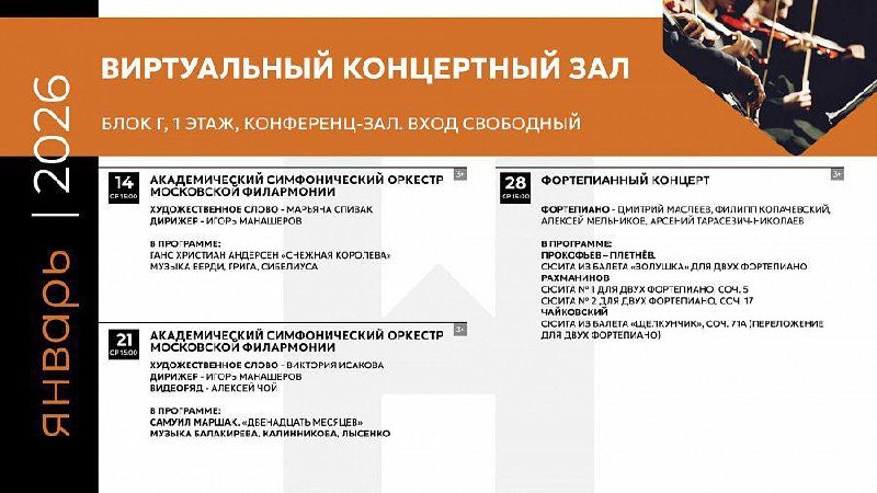 Просмотры проходят каждую среду в 15:00 в конференц-зале библиотеки (1 этаж, блок Г). Вход свободный, по читательскому билету. Расписание показов на январь: 14 января Концерт Академического симфонического оркестра Московской филармонии под управлением дирижера Игоря Манашерова. Художественное слово – Марьяна Спивак. 21 января Концерт Академического симфонического оркестра Московской филармонии под управлением дирижера Игоря Манашерова. Художественное слово – Виктория Исакова. Видеоряд – Алексей Чой. 28 января Концерт фортепианной музыки. Выступают Дмитрий Маслеев, Филипп Копачевский, Алексей Мельников, Арсений Тарасевич-Николаев. Солист – Михаил Плетнев.