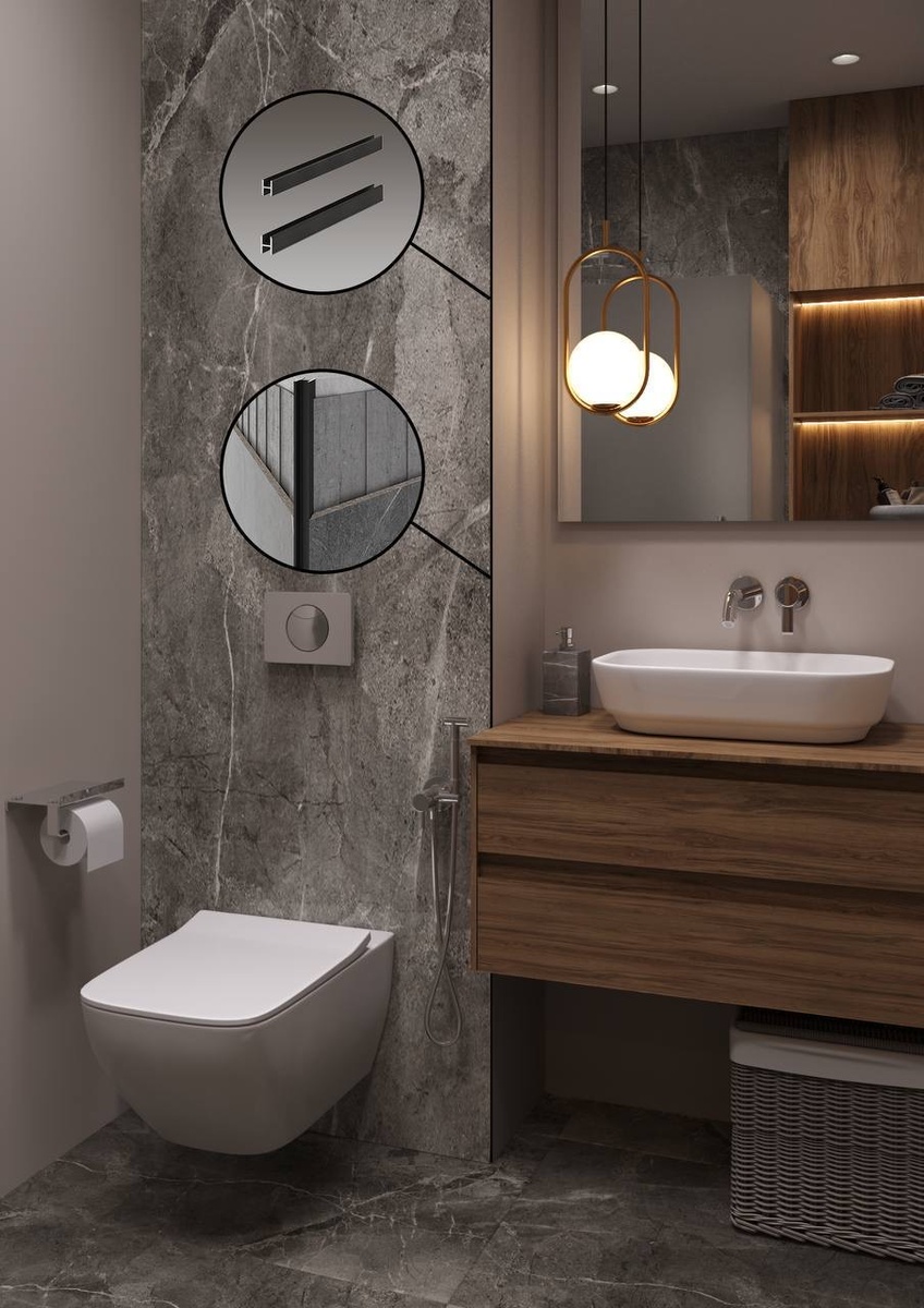 Он позволяет соединять керамогранит, краску и декоративную штукатурку в одной плоскости через выразительную теневую линию - деликатно и почти незаметно для глаза.
