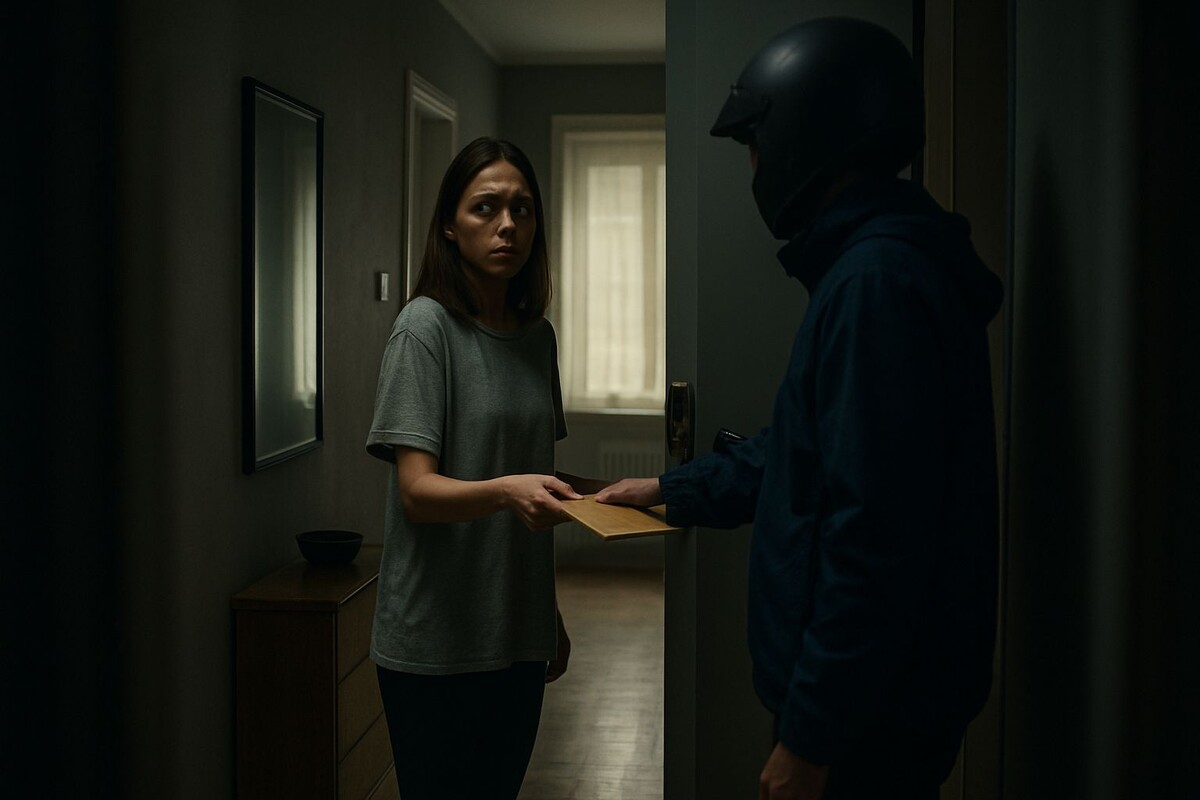 Ровно в четырнадцать ноль две на экране подъехал скутер. Чёрный, без опознавательных знаков. Курьер в синей ветровке с капюшоном, лицо скрыто шлемом. Он нажал кнопку домофона. Мое дыхание замерло. Через мгновение в кадре появилась Лера. Она была в домашних лосинах и моей старой футболке. Волосы собраны в небрежный хвост. Она выглядела… обычной. Слишком обычной для спектакля.