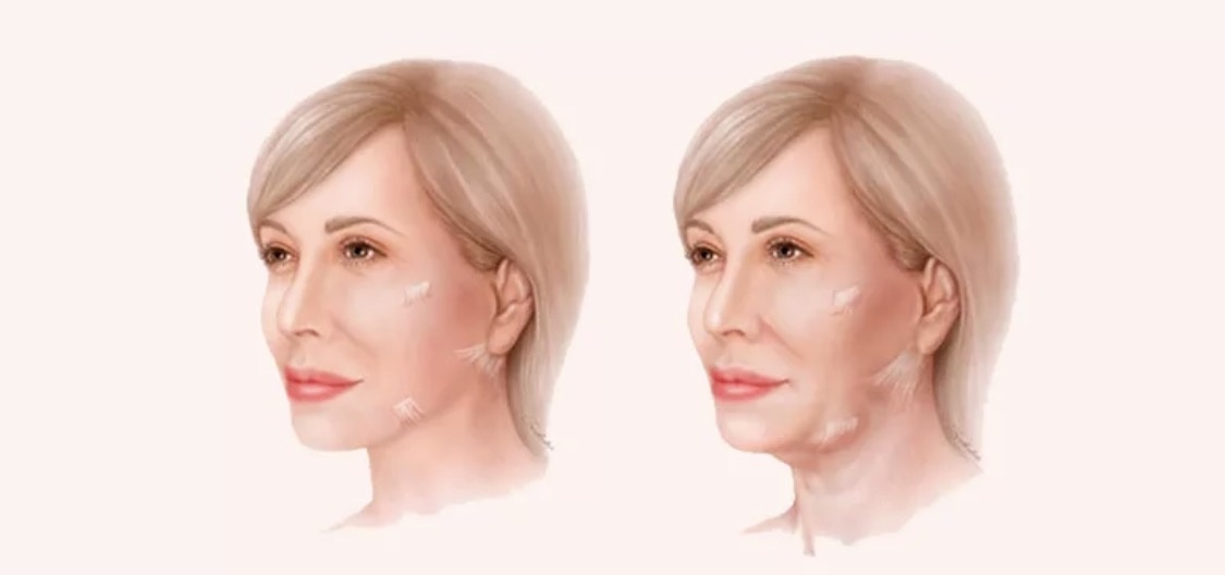 И, если мышцы слабы, то подъязычная кость опускается вниз и формирует оплывший овал лица, переход между шеей и овалом лица сходит на нет. Формируется второй подбородок.