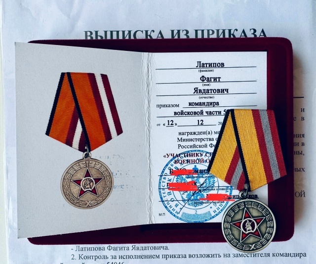 Участник СВО Латипов Ф.Я. , за образцовое исполнение воинского долга, самоотверженность и дисциплинированность при выполнении боевых задач в зоне СВО, награждён наградой Министерства обороны России медалью "Участнику специальной военной операции". Приказ подписан 12 декабря 2025 г. - N1950. Медаль «Участнику специальной военной операции» относится к ведомственным наградам Министерства