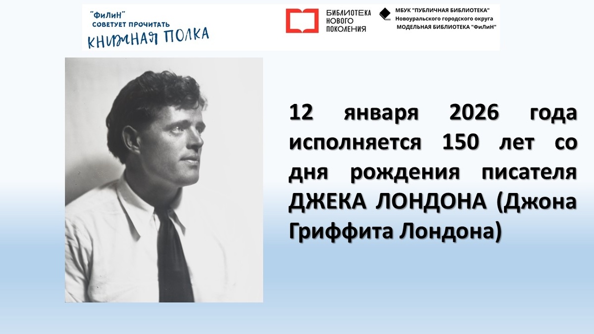 12 января 2026 года исполняется 150 лет со дня рождения американского писателя Джека Лондона. Опасные приключения, поиск сокровищ, увлекательная история любви завораживающей истории далеких потомков великого пиратского капитана, которые отправились на поиски старинного клада, оставленного их легендарным предком. Белый Клык, полусобака-полуволк, родился на Аляске. Он жил в индейском племени и бегам в упряжке, в форте Юкон его на потеху публике стравливали с другими собаками. Люди обращались с Белым Клыком жестоко, и он превратился в свирепого, опасного и мстительного зверя. Во время одного из собачьих боев за него вступился горной инженер Уидон Скотт; он выкупил полумертвого пса у прежнего хозяина и забрал с собой. Терпением и добротой Уидону Скотту удалось заслужить доверие Белого Клыка и стать ему другом. Герой романа "Межзвёздный скиталец" обретает поразительную способность раскрепощать подсознание и путешествовать по иным эпохам, заново проживая свои прошлые жизни; в рассказе «Жел