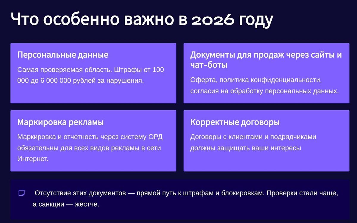 📌Какие документы должны быть у предпринимателя в 2026 году — чек-лист В 2026 году бизнес будут проверять чаще: не только «по жалобе», но и по результатам выявленного с помощью ИИ отстутвия документов на сайтах, в формах сбора заявок, чат-ботах, при размещении рекламных материалов. И чаще всего проблемы возникают не потому, что бизнес «что-то нарушал специально», а потому что не знал, какие документы обязаны быть у него по закону. 📌Я собрала чек-лист предпринимателя на 2026 год, в котором: ✔ все обязательные документы для ИП, самозанятых и компаний ✔ отдельный блок по персональным данным (самый проверяемый в 2026 году) ✔ документы для сайтов, лендингов, чат-ботов и онлайн-продаж ✔ договоры, реклама, маркировка, интеллектуальная собственность ✔ на что в первую очередь обращают внимание проверяющие органы 📎Формат — коротко, структурировано, без воды. 🔗 Скачать чек-лист можно здесь https://disk.yandex.ru/i/OaULD6h1tEqg-A 📌Если материал оказался полезным — поделитесь этим пост