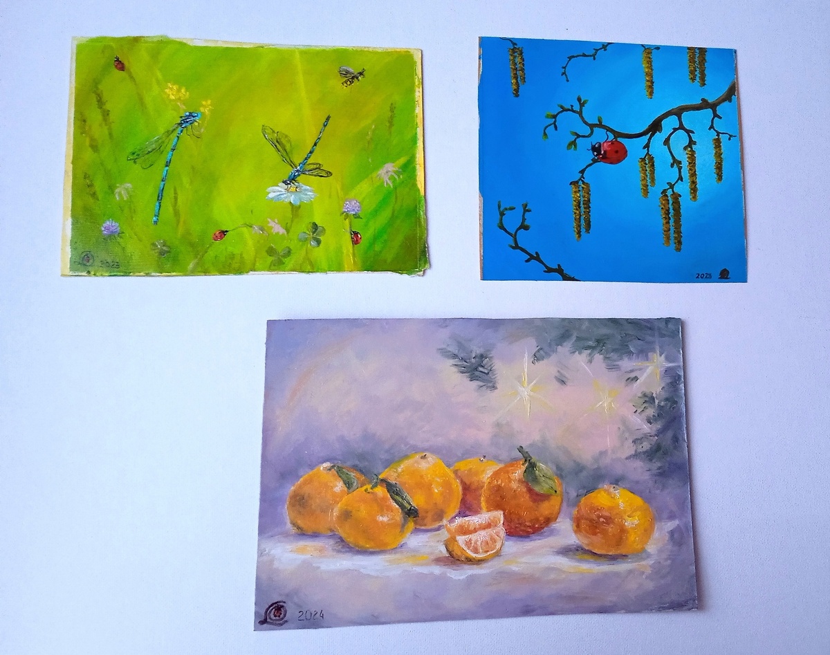 С картоночками маленького размера у меня связаны добрые воспоминания. Первые уроки, когда для разминки, перед тем как работать на холсте, мы смазывали льняным маслом обычный тонкий картон и затем на нём выполняли неуклюжий пейзаж. 2013 -й, спокойный и благополучный год. С тех пор мне очень сложно выбросить "отлично подходящий" картон в виде разных упаковок:) только сейчас я грунтую акрилом, а не маслом покрываю. Такой вот живописный апсайклинг. Все эти работы давно нашли своих хозяев. Стрекозы уехали в Беларусь, а Божья Коровка теперь живёт на Урале. Рукодельники 0 постов • 0 подписчиков Подписаться Добавить пост Подробнее о правилах