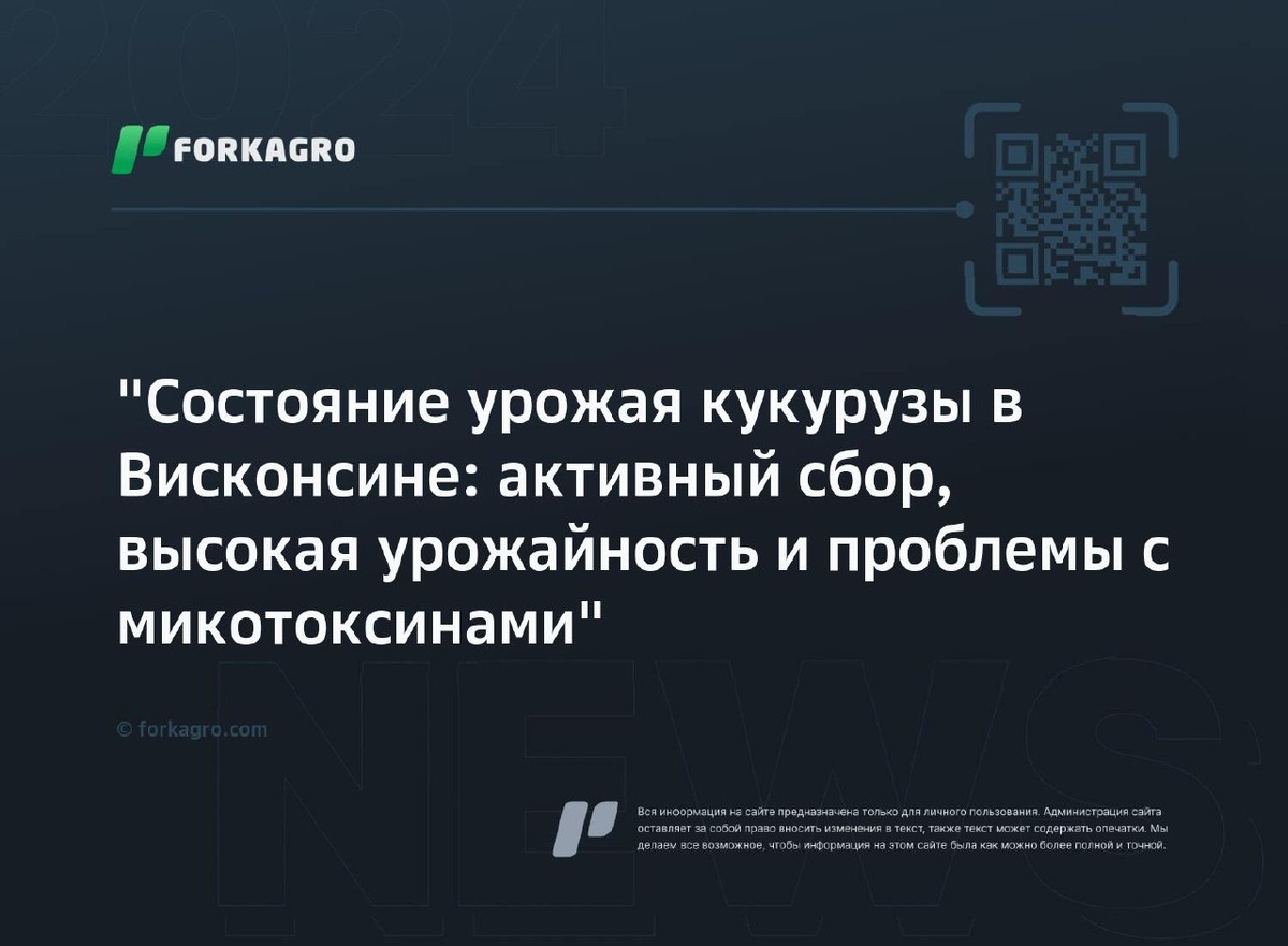 " Департамент сельского хозяйства США приостановил отчет о текущем положении по урожаю. В Висконсине кукуруза собирается активно: на юге уже 15% убрано, на севере только начинают. Уровень влажности в целом снижается, урожай оценивают как хороший. Наблюдаются проблемы с микотоксинами, что может негативно сказаться на сохранности зерна. Рекомендуется контролировать влажность и хранить зерно сухо и прохладно. Перейти к источнику