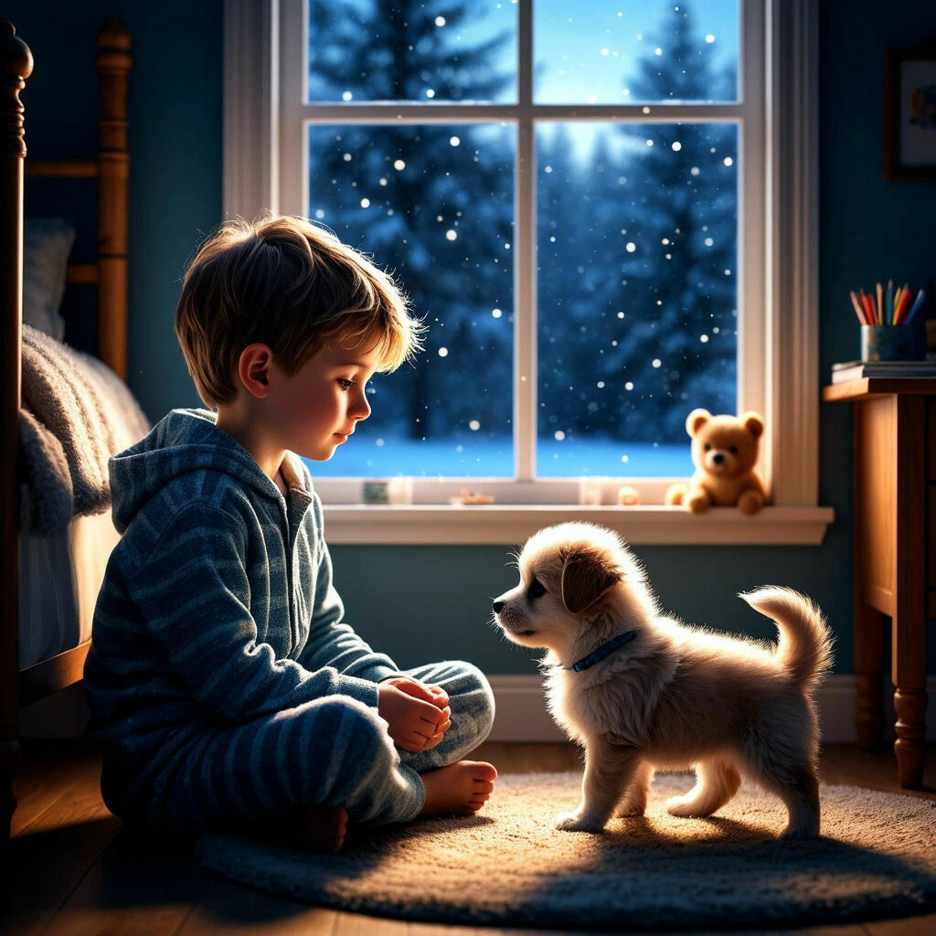 И тут случилось невероятное. Маленький щенок перебежал с карниза на подоконник через закрытое окно. Прямо сквозь стекло! Посмотрел на мальчика, спрыгнул на пол и с громким воинственным лаем помчался на выручку. Он носился по комнате словно пушистое солнышко, отгоняя темноту и жутких чудищ, а Миша смотрел на щенка, и счастливая улыбка озаряла его лицо, ещё совсем недавно едва не ставшее мокрым от горьких слёз обиды. Вся комната озарилась мерцающим светом. В воздухе вспыхивали разноцветные огоньки, как будто мириады светлячков закружились в волшебном, красивом танце. Страх прошёл, словно его и не было, а вместе с ним исчезли чудища и призрачная рука.