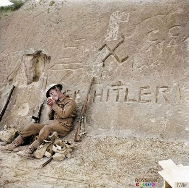 Британский солдат отдыхает рядом со свастикой и словами «Хайль Гитлер», вырезанными на скалистом склоне.