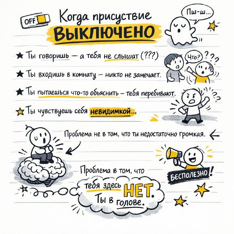 Они не кричат. Не машут руками. Не привлекают внимание специально. Они просто входят — и что-то в воздухе меняется. А есть другие: говорят, объясняют, доказывают — а их не слышат. Как будто они невидимы. Разница в феномене присутствия. И оно живёт не в голове, а в теле. Это не харизма от рождения и не "умение подать себя". Это способность быть ЗДЕСЬ — полностью, всем телом, сейчас. Когда тело отключено, ты в голове: - Думаешь о прошлом ("сказала ли я что-то глупое?") - Думаешь о будущем ("как они обо мне думают?") - Анализируешь, контролируешь, волнуешься Ты физически здесь, но тебя здесь НЕТ. Часть тебя отсутствует. Люди это чувствуют. Даже не осознавая, они чувствуют: ты не полностью с ними. Ты где-то в своих мыслях. Когда тело включено, ты ДЕЙСТВИТЕЛЬНО присутствуешь: - Не в голове, а в теле - Не в мыслях о прошлом-будущем, а сейчас - Не в анализе, а в ощущении - Полностью И люди это чувствуют мгновенно. Представь. Вся семья за столом. Муж, дети, может быть родители. Т