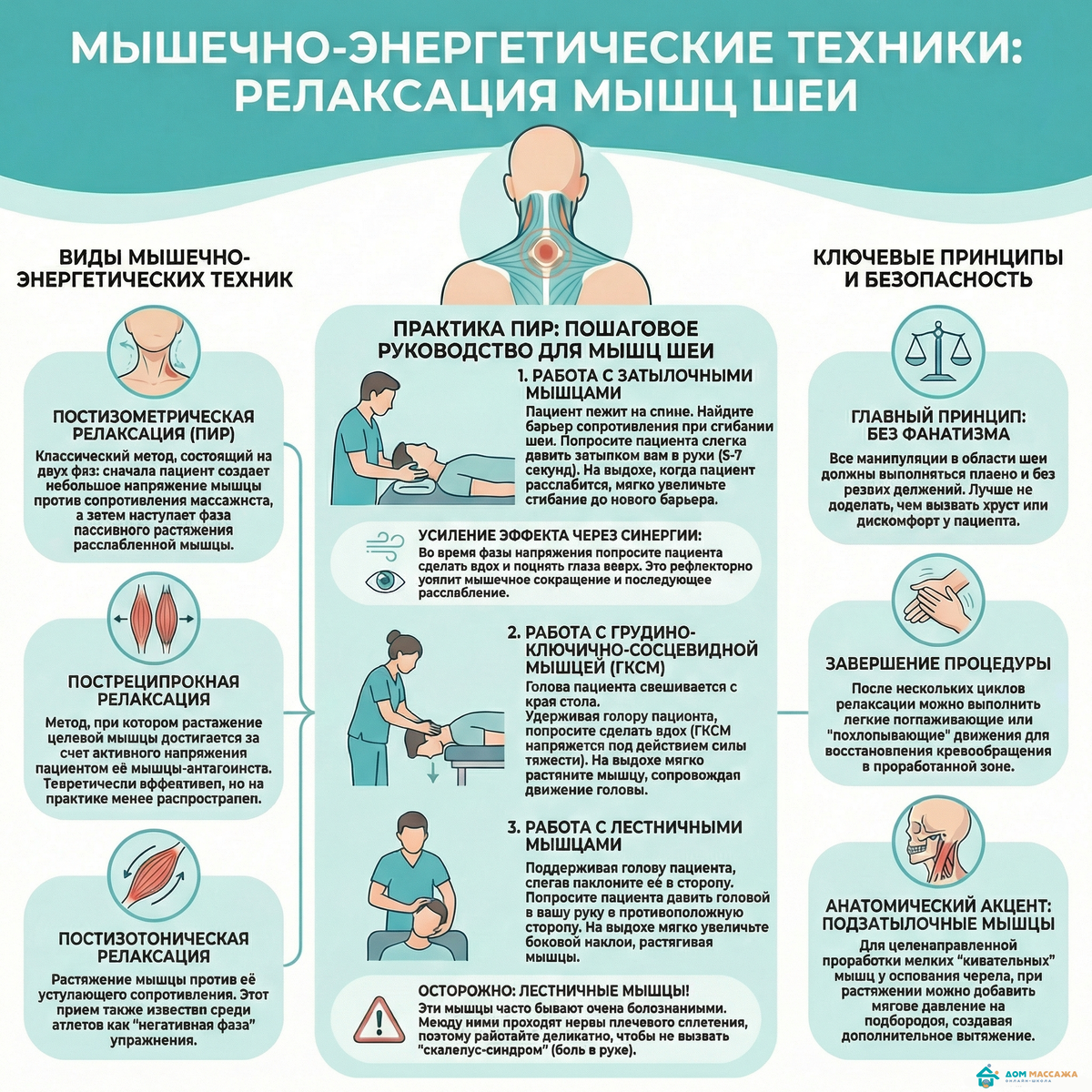 Мышечно-энергетические техники (МЭТ) — это специальные методы мануальной терапии, которые используют собственную энергию мышц пациента для их глубокого расслабления и растяжения. Вместо того чтобы просто пассивно тянуть напряженную мышцу, специалист просит клиента совершить определенное усилие, которое запускает в организме естественные рефлексы расслабления.