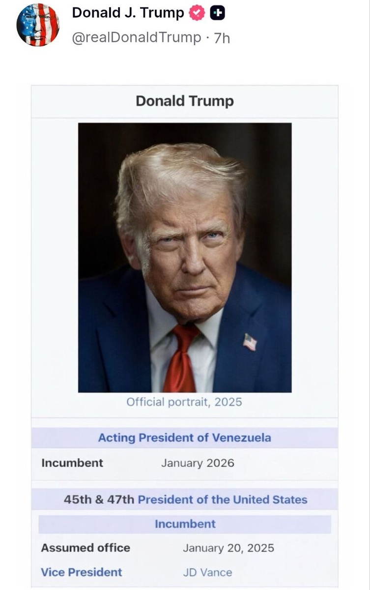 Трамп назвал себя президентом Венесуэлы Президент США Дональд Трамп опубликовал на своей странице в социальной сети Truth Social пост, где назвал себя “президентом Венесуэлы”, передаёт Centralmedia24. 💬В публикации содержится фото, которое напоминает его биографию из Википедии (самая крупная и популярная в мире онлайн-энциклопедия). На скриншоте в строке “должность” сказано, что он является “исполняющим обязанности президента Венесуэлы”. Согласно информации на изображении, он якобы занимает эту должность с января 2026 года. В Белом доме информацию пока не прокомментировали. 3 января Дональд Трамп поручил нанести удары по столице Венесуэлы. В результате в районе военных баз Форт Тиуна и авиабазы Франсиско де Миранды прогремело как минимум семь взрывов. В ходе операции американские военные задержали президента Венесуэлы и его супругу. 📌4 января стало известно, что они находятся в следственном изоляторе в Бруклине и должны предстать перед федеральным судом Манхэттена. Однако Дональ