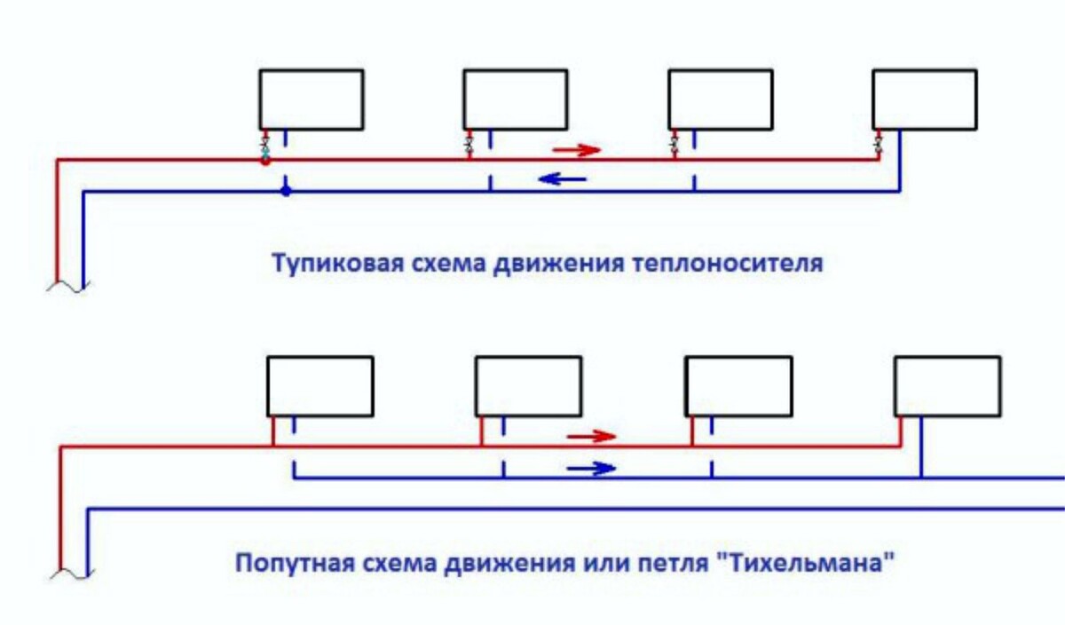 Последнюю еще называют схема «Тихельмана» и чем она отличается от тупиковой, обсуждали в этой статье: